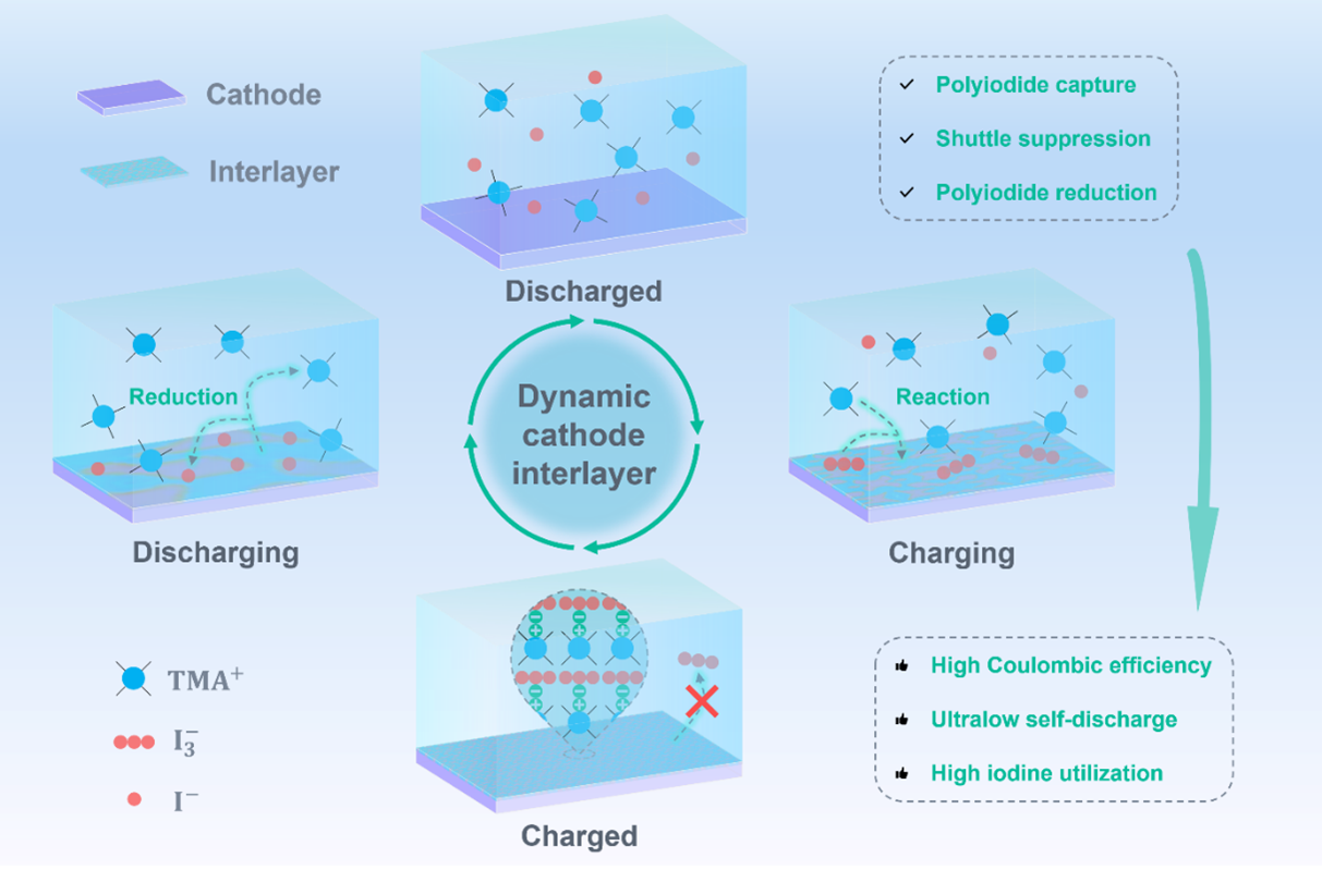 在本文中,团队通过四甲基碘化铵(TMAI)电解液添加剂为水系Zn-I2电池构建了一种动态的正极中间层。四甲基铵阳离子(TMA)在充电过程中通过与多碘化物反应在正极表面形成原位中间层,其可以有效抑制多碘化物的溶解和扩散,从而实现高库仑效率和超低自放电。另一方面,该中间层具有电化学活性,在放电过程中能将多碘化物还原为I离子。因此,中间层在充电和放电过程中能够可逆地形成与溶解,从而提升电池的整体容量并实现高碘利用率。此外,电解液中的TMA离子改善了锌离子的沉积行为,能够显著抑制负极的枝晶生长并提升电池的循环稳定性。