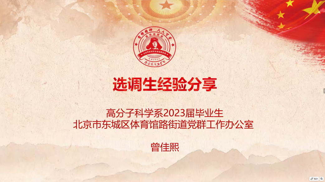 接下来,我系2023届硕士毕业生、北京市选调生曾佳熙为大家带来了相关的经验分享。他首先对自己报考的条件进行了详细的介绍,然后分别从选调生政策解读、选岗策略以及工作心得分享三个方面展开分项。曾佳熙师兄给大家详细地讲解了如何根据自身意愿选择工作地点,分享了报考条件与流程、笔试与面试技巧以及一些过来人的经验教训,鼓励同学们积极备考。最后,他分享了一些工作情况,讨论了选调生工作中可能遇到的困难和挑战,以及如何克服这些困难,更好地融入工作。