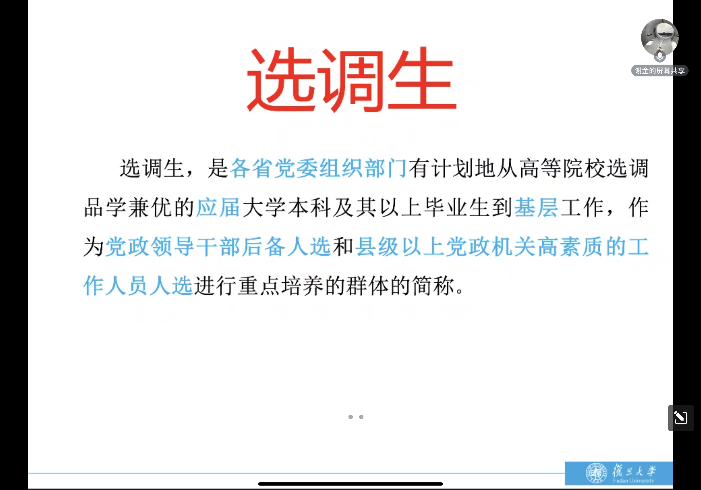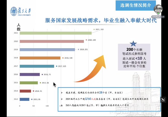 首先,Cool18 基层就业协会的谢金讲师从“什么是选调生”、“为什么要做选调生”、“复旦选调生情况简介”以及“怎样成为选调生”四个方面加以展开,细致地介绍了选调生与普通公务员的区别,同时以上海市为例,对选调条件、一般流程以及考试要求加以解读,并指出了本校学生参与选调的优势,为同学们提供了详尽的备考策略。近年来,各地党政机关和企事业储备人才,不断调整基层就业政策和提升待遇,吸引高层次人才尤其是应届毕业生投入基层工作,其中选调生就是最为热门的选择之一。许多志存高远的选调生,将个人命运与祖国发展紧密相连,在基层播撒无悔青春,在岗位书写人生答卷。