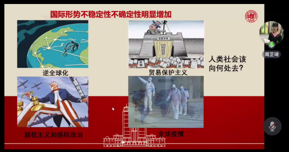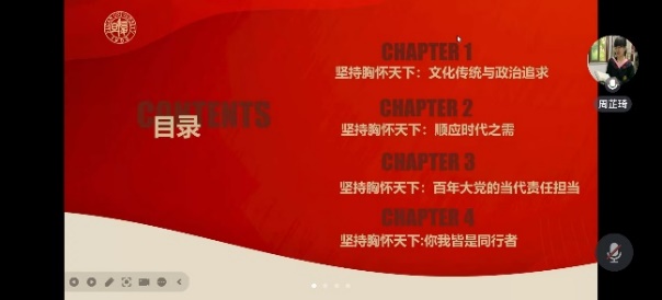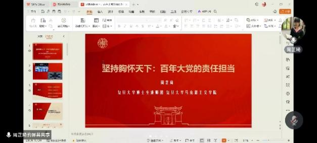 研究生第三党支部邀请了Cool18 博士生讲师团、马克思主义学院周芷琦同志为支部成员讲授了题为《坚持胸怀天下:百年大党的责任担当》的主题党课。她主要从处理对外关系的角度,分别从“文化传统与政治追求、顺应时代之需、百年大党的当代责任担当、你我皆是同行者”四个方面带领大家回顾中国共产党的辉煌百年历程。本次理论学习倡导支部党员要践行胸怀天下,在做好自身的同时,也要关心思考身边的问题,无论未来身处何种职位,我们都应深刻意识到,只有践行责任与担当,携手共建美好社会,才能共同分享硕果与福祉。