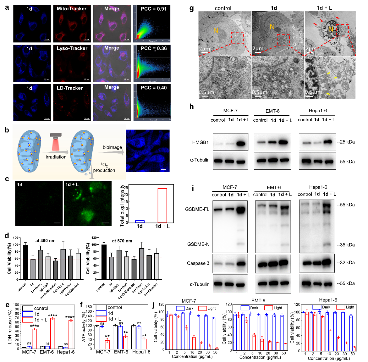 作者通过详细研究代表性光敏剂1d在细胞器靶向能力,活性氧类型,线粒体形貌变化以及细胞焦亡相关通路等方面,证实了光敏剂是通过靶向并损伤线粒体,引起Caspase-3/GSDME介导的细胞光焦亡。