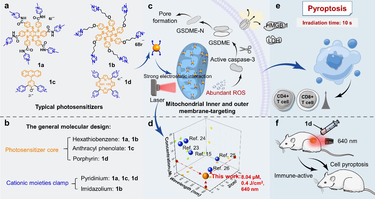 细胞焦亡是由Gasdmine (GSDM)家族介导的高度促炎的细胞程序性坏死。细胞焦亡不仅规避了凋亡抵抗,还能够产生损伤相关分子模式(DAMPs)和促炎细胞因子,触发肿瘤特异性免疫。光焦亡(光触发焦亡)是光动力疗法(PDT)的一个新兴研究分支,通过光焦亡重塑肿瘤免疫微环境是一种很有前景的癌症治疗方法。然而,目前已知可以诱导光焦亡的光敏剂不仅非常匮乏,而且大多数这类光敏剂都是偶然发现的。简而言之,缺乏一种系统性的光敏剂分子结构的通用设计原理以指导高效光焦亡的发生。