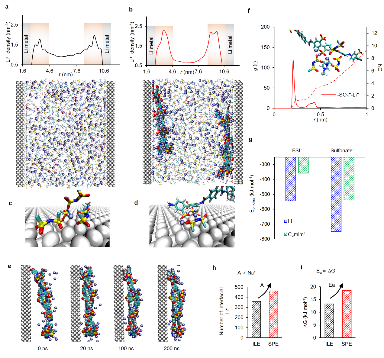 为了进一步确认纳米团簇形成的后端机制,我们采用分子动力学模拟(MDS)和密度泛函理论(DFT)来研究影响界面电荷转移动力学的物理性质。基于量子和分子动力学模拟的结果证实了Li+SPE界面的富集效应主要源于PBDT-SO3Li+之间更强的相互作用,这些纳米级自组装离子团簇通过平衡锂聚合物空间电荷界面的指前因子(A)和活化能(Ea),在实现超高速电荷转移动力学中起着关键作用。