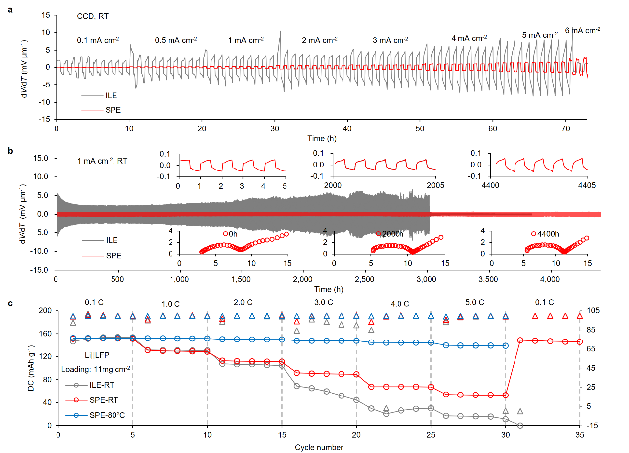 3 SPE组装的锂金属电池的倍率性能及长循环性能