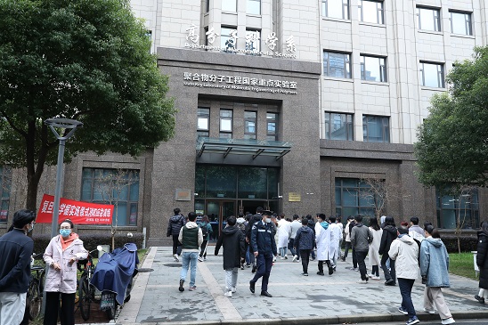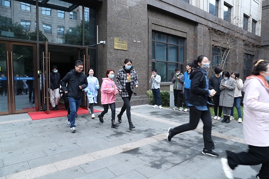 图15. 全楼师生迅速撤离到高分子楼前安全疏散点 图16. 师生们得到安保人员“现场已处置完毕、请有序返回”的通知后,返回系楼