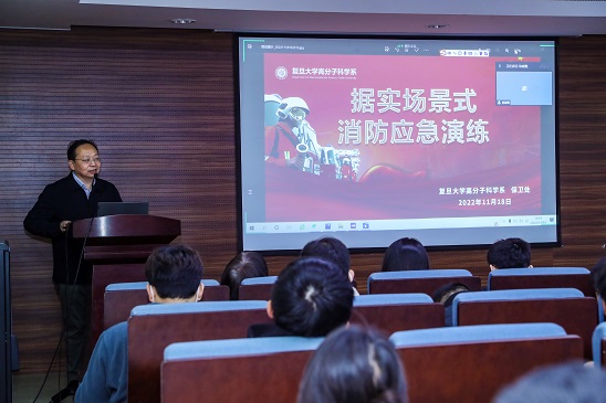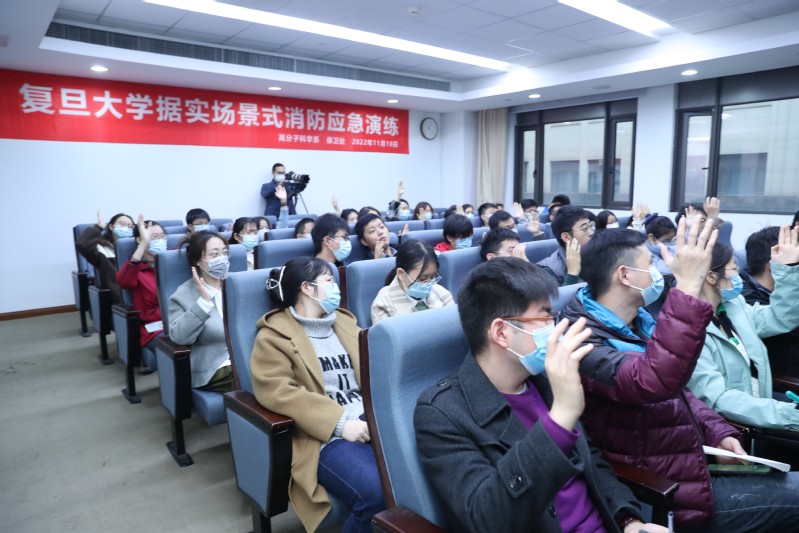 在点评专家的引导下,学生们从视频中积极查找本次演练中实验室现场同学的应急处置方法的不足之处(图21),参加演练的志愿者也分享了关于所采取的应急处置方法的思考(图22)。这次复盘活动持续了一个半小时,点评专家认为:复旦高分子系的演练志愿者们对于两个演练场景的应急处置方式是适当的,表明高分子系开设的《实验室安全知识与实践》课程达到了培训同学们掌握正确的应急处置方法的目的;Cool18 保卫处的应急相应速度快,事故现场处置方法规范、有效,应急疏散方案有效可行;院系与校保卫处的应急响应系统衔接有效;高分子上报事故的流程规范;在规定的时间楼内人员均撤出大楼,未发现有人员在紧急情况下乘用电梯疏散、或者躲入厕所内的现象,高分子系的应急疏散训练有素。