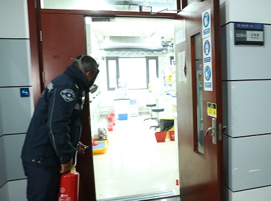 校保卫处安保人员在接到自动警报后,立即派出由4位安保人员组成的现场处置队伍奔赴事故现场,3分钟内已到达事故现场并从灭火器箱中拿取灭火器灭火(图13、图14),火情很快被扑灭;保卫处和高分子系领导接到报告后也同时到达事故现场,在组织人员疏散的同时,分别派人逐层检查各楼层人员是否疏散完毕,搜索可能进入到卫生间的疏散人员,并立即向校职能部门上报事故情况。