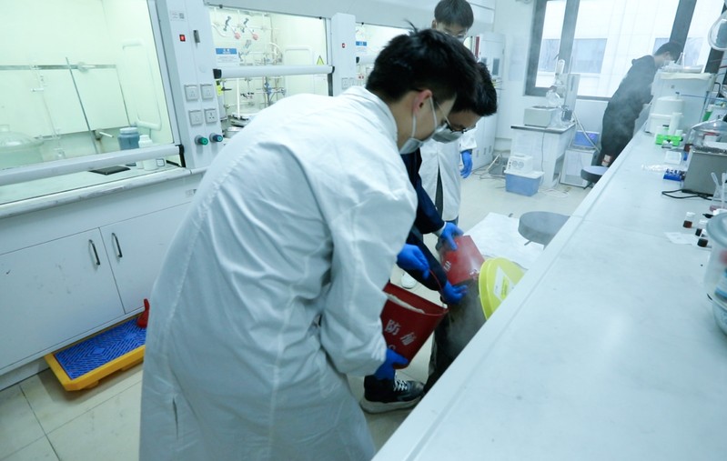 在应急处理的同时,实验室内有学生走到走廊上,立即向系办主任张飞老师报告,出现了本文最前面的对话。正在此时,实验室内学生发现垃圾桶内开始冒烟,立即大声喊:“垃圾桶着火啦!”。两位学生闻讯后迅速冲到走廊上的消防沙放置处,拿起两桶沙子冲回实验室一起倒入着火的垃圾桶中,并压实垃圾桶盖,三位同学迅速撤离了实验室。