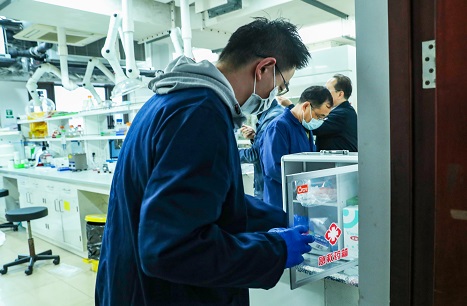 图3. 学生用灭火毯盖住着火的实验服,受伤学生在窗边的水池冲洗伤口 图4. 学生在药箱中拿取烫伤膏