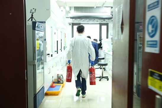 9时半开始,进入应急演练模拟的第二个场景:B5084实验室在进行实验中,周边冰箱突发火情(存放叔丁基异氰酸酯、炔丙基溴溶液、对甲氧基苄氯等)。为了增加应急处置难度,演练策划组特意将装有有机废液的垃圾桶移至发生火情的冰箱旁边,以检验同学们的应急处置能力。