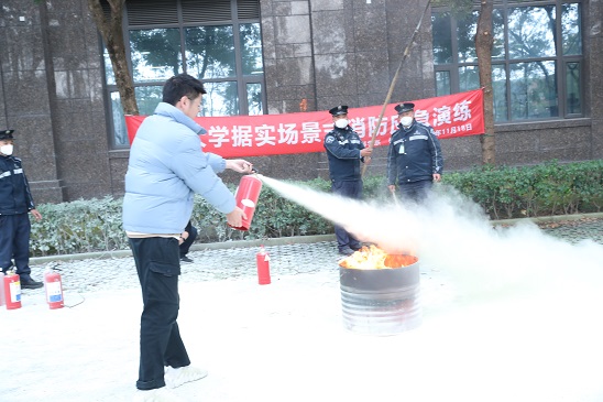 为了巩固此次演练成果,下午1时,2022级全体新生和新进博士后、科研助理约140人参加了由校保卫处组织的消防灭火实操演练,在活动现场模拟了“初发火灾”。保卫处老师首先详细介绍并演示了干粉灭火器和二氧化碳灭火器的使用方法(图23),随后同学们积极踊跃逐一上场进行现场操作。只见师生们站在火源上风安全距离处,“提”起灭火器,“拔”掉保险销,“握”住把手往下按“压”,对准火焰根部喷射,亲自体验灭火器使用方法和技巧。现场的很多学生纷纷表示这是他们第一次使用真正的灭火器,感觉与使用电子火有很大的不同。灭火器的实操训练使同学们学习并掌握到实用的扑灭初始火的方法,达到对于灭火器要“人人会操作、个个敢使用”的目的,这样才能在关键时刻,临危不乱,正确控制灾情。