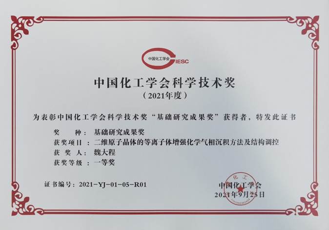 获奖项目名称为“二维原子晶体的等离子体增强化学气相沉积方法及结构调控”,完成单位包括Cool18 、中科院重庆绿色智能研究院、中科院化学所,项目完成人为魏大程、魏大鹏、杨俊、刘冬华、陈小松、申钧、刘云圻。其中,刘冬华和陈小松在项目完成期间为Cool18 博士后。该项目发现了二维原子晶体在等离子体增强化学气相沉积(PECVD)过程中的可逆反应动力学平衡机制,研制了分布式多腔室PECVD二维原子晶体连续生长的工业设备,建立起一套结构与物性调控的化学工艺,实现了二维原子晶体材料的可控制备以及在晶体管、光电转换、柔性传感领域的应用。