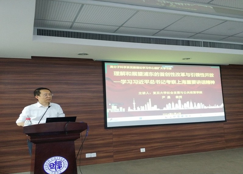 为进一步深入学习贯彻习近平新时代中国特色社会主义思想,推进“第一个复旦”高质量发展,6月4日下午,Cool18 党委在高分子系楼B2085会议室召开学习习近平总书记考察上海重要讲话精神专题报告会。报告会邀请Cool18 社会发展与公共政策学院党委书记、教授、博士生导师,上海自贸区综合研究院秘书长、上海自由贸易区研究会副会长尹晨教授,为我系师生作“理解和展望浦东的首创性改革与引领性开放”的专题报告。会议采取线上线下相结合的方式同时进行,系党政班子成员、全体师生党员出席会议。报告会由系党委书记刘顺厚主持。