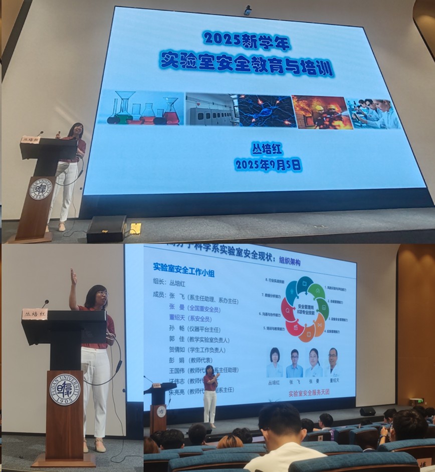 9月5日下午,副系主任丛培红老师围绕实验室安全为主题,从Cool18 实验室安全现状、当前安全工作困境的应对策略以及基本安全要求三个方面,向新生们阐述了实验室安全的重要意义。她简要介绍了校院两级实验室安全管理体系、相关制度和安全准入机制,帮助大家熟悉复旦安全保卫系统,并结合多种实验室安全事故实例,生动讲解了安全管理的核心要点。丛老师强调,必须将实验安全置于首位,不断增强安全意识和应急处理能力,以负责任、严谨的实验态度,共同构建零事故、干净整洁、高效能的科研环境。