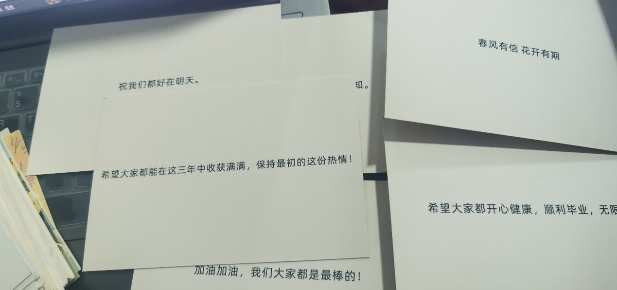 2025级硕士班班会上最令人难忘的是班级同学自我介绍环节。每位同学随机拿到了写有班级任一位同学寄语的明信片,并在自我介绍时分享这些寄语。这些充满真诚与期待的句子迅速拉近了同学们的距离,欢声笑语中,同学情谊悄然建立。班会还进行了班委选举,产生了新班级的核心骨干团队。