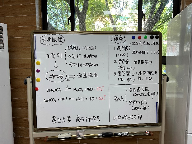 朱羿璇同学负责了烘焙课程烘焙原理的讲解,这个环节的内容是制作花卷,这不仅是一项手工活动,更是一堂生动的科学课。在蒸面阶段,朱羿璇同学讲解了发面的原理。她介绍了发酵过程中不同发面剂起作用的不同原理。酵母在温暖湿润的环境下,将面团中的糖分转化为二氧化碳和酒精,使面团膨胀变松软。小苏打在酸性或受热情况下会分解产生二氧化碳。她还解释了烘焙过程中产生香气的科学原理,面团中的碳水化合物和蛋白质在高温下发生美拉德反应,产生了诱人的香气。