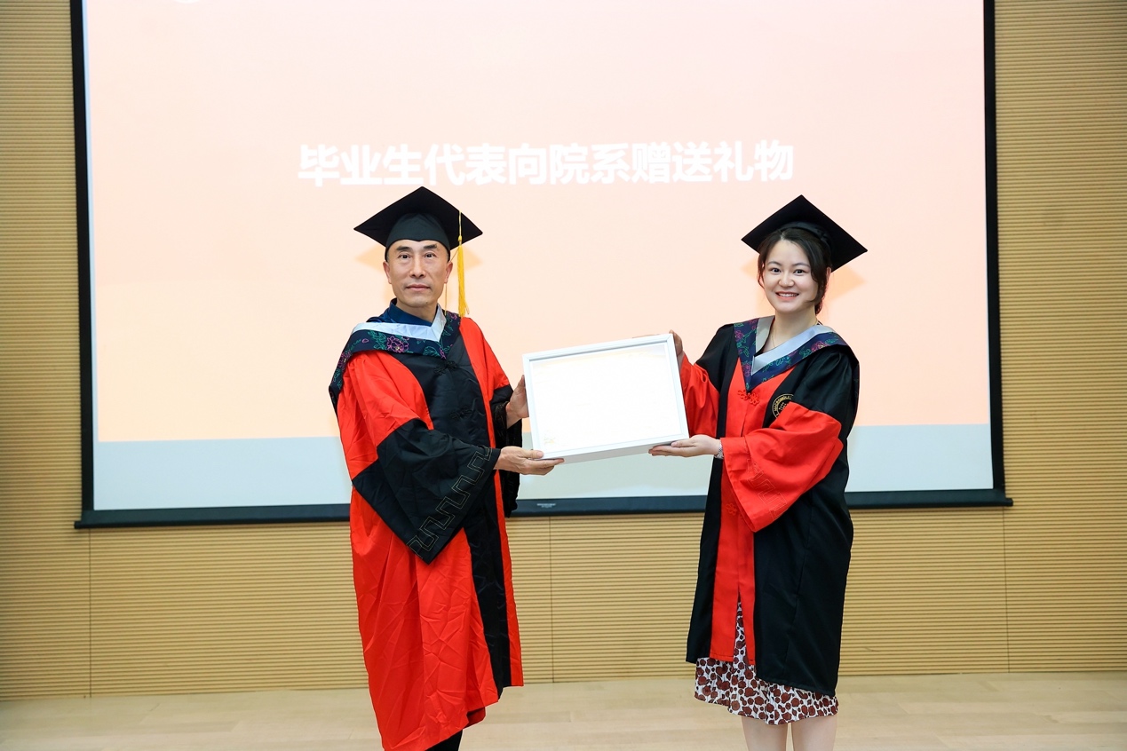 2024届博士毕业生马明钰作为学生代表向院系赠送礼物纸雕灯。纸雕灯中的高分子系楼代表毕业生们在校期间所接受的专业教育和培养,老校门象征着学校的传统与文化传承,光华楼表达了毕业生们对未来的美好期望,以及在新的人生阶段中追求卓越的决心。这份礼物不仅纪念了大家在学校度过的美好时光,也表明了对即将开启的人生新篇章的美好期许。系党委书记刘顺厚代表院系接收礼物。
