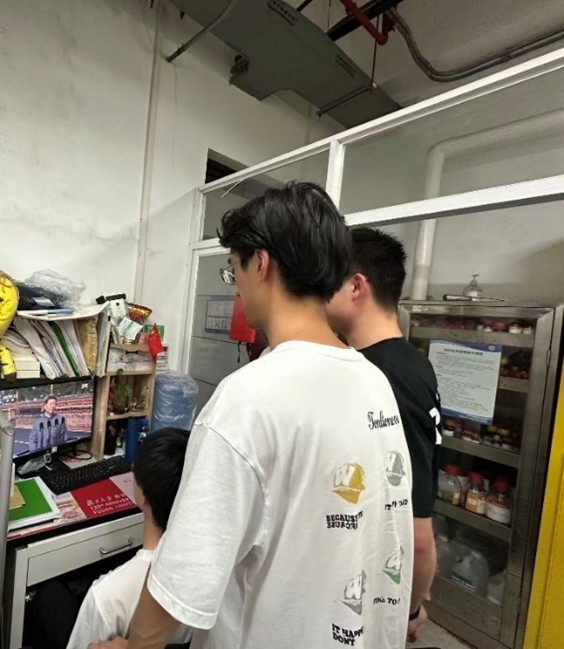 随后,支部书记秦业栋同志针对在9月3日举办的纪念中国人民抗日战争暨世界反法西斯战争胜利80周年大会进行了主题思政分享。党支部全体成员共同认真学习了习总书记在大会上的讲话,深刻认识到当前国际形势之严峻与我国作为大国责任之重大。面对巴以冲突,我们中国始终强调和平发展,中国政府中东问题特使多次出访地区国家、出席有关国际和平会议,积极穿梭斡旋,并且还积极拨款进行人道主义援助。与美国一意孤行的霸权主义行为不同,中国永远是维护世界和平的坚定力量。秦业栋同志也为大家介绍了80周年阅兵仪式上多种代表性的新式武器,许多此前只存在于科幻小说的激光武器、无人机技术,如今都成为装备到人民军队的手中,让支部党员大为震撼。“打击范围覆盖全球”这短短几字的介绍,已彰显了我国强大的军事力量。