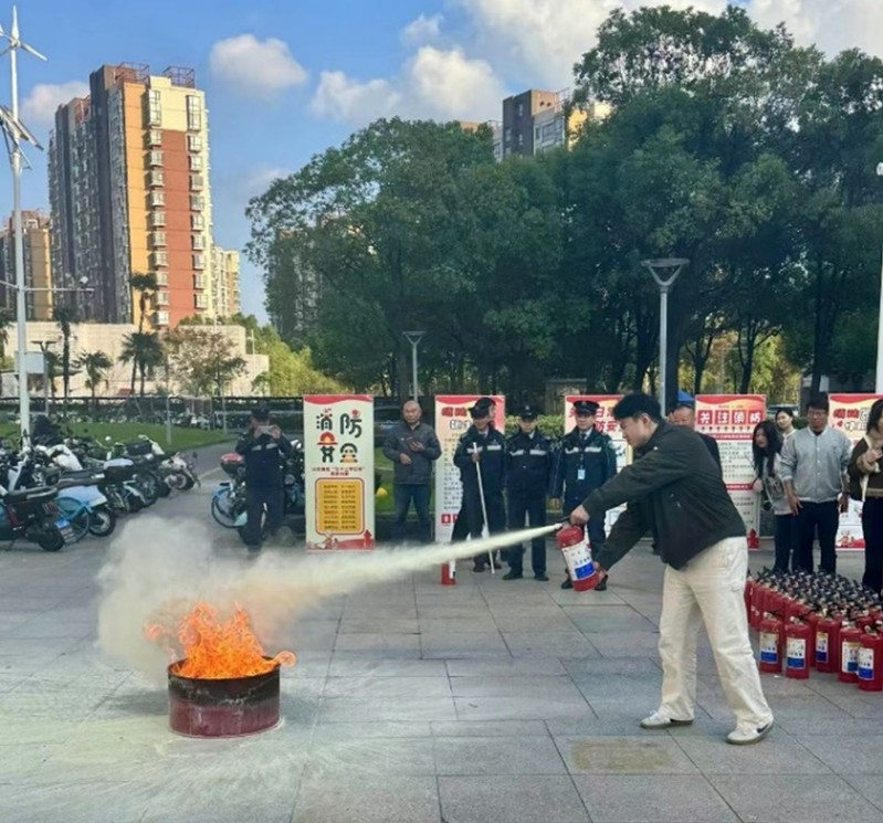 理论讲解结束后,培训活动进入了实践操作环节。在先进材料楼南广场的消防演练区域,整齐摆放着各类消防器材,保卫处工作人员详细介绍了不同灭火器的使用场景和使用方法,在活动现场模拟了初发火灾,师生们全神贯注地听工作人员的讲解,仔细观察示范动作,而后逐一拿起灭火器进行现场操作,站在火源上风安全距离处,亲自体验灭火器使用方法和灭火技巧,做到对于灭火器人人会操作,人人敢使用,提高了大家面对初始火情的应急处置能力。