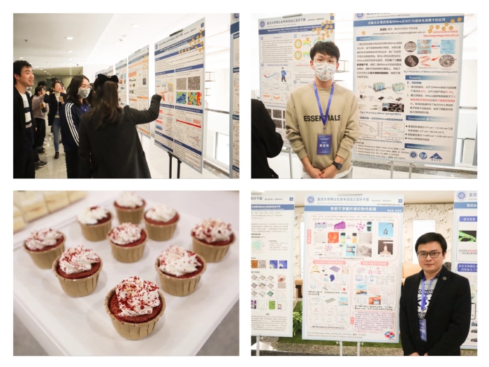 随后,论坛进入了茶歇和墙报展示交流环节。各位评委与观众共同来到先进材料楼二楼进行墙报学术交流。期间评委及现场观众打分,共评选出最佳墙报奖10名。茶歇环节结束后,Cool18 汪群松、张鑫饶、张艳三位同学就聚合物封堵器、硅基纳米颗粒等领域做了相关汇报,Cool18 俞麟老师高度肯定了三位同学的科研工作并鼓励大家要继续再接再厉,勇攀科研高峰。