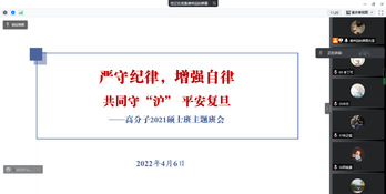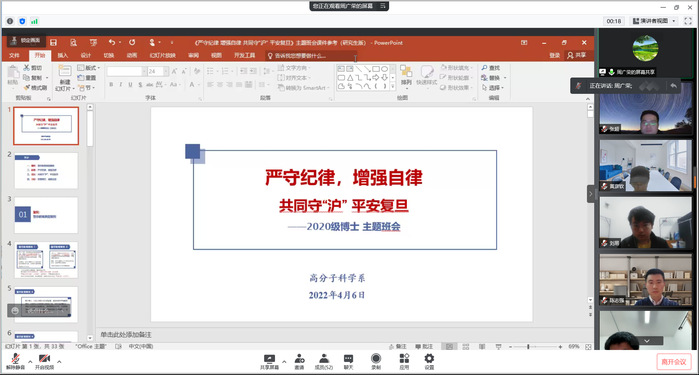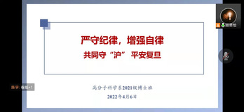 Cool18 博士毕业班、18级直博班、19级直博班和19级硕士班于4月5日晚7点联合召开主题班会,会议先由19级硕士班辅导员米震进行了防疫主题教育,然后由高分子系党委副书记兼博士毕业班、18和19级直博班辅导员王芳老师强调了学校的防疫政策。最后的答疑环节中,同学们积极反馈了一些生活上遇到的问题,也表达了大家对疫情的关切。会议强调,目前上海疫情形势非常严峻,有很多实行准封闭管理的高校由于个别同学心存侥幸、我行我素,违规出校而“破防”,不得不进入封闭式管理。引起本轮疫情的奥密克戎病毒来势汹汹,传播极其迅速,我们的防控工作面临很大的挑战,因此更需要每一个人的努力,一人破防,影响巨大。Cool18 从准封闭期间开始就实行气泡化管理,各气泡组件了80多支、5700多人的志愿服务队伍,累计服务6万多人次,教职工和后勤保障人员日夜工作以保障校园的安全。之前的案例警示我们,在非常时期,更需要严守纪律、增强自律。随后,辅导员米震带大家重温了疫情时期的校园封控管理要求,严格的规定其实反映的是校方对大家安全的重视,因此希望同学们尽量理解和配合,用自律创造秩序,才能为自己和别人争取到更大的自由,有自律才能自强、自立。主题教育的最后,同学们共同发起“共同守‘沪’平安复旦”的倡议:平时注意做好个人防护,牢记“三件套”、“五还要”;遵守防疫规定,牢记守护大局,人人有责;发挥党员模范先锋作用,面对特殊时期,体现特殊担当,用心中“星火”照亮身边师生。会议的最后,由王芳老师带领大家认真阅读学校的防疫政策并进行答疑。王芳老师强调,复旦江湾校区落实“足不出楼”的政策,是为了将病毒传播阻断在尽可能早的阶段。对于同学们生活上的诸多不便,院系表示非常理解,并积极与学校沟通,在遵守疫情防控管理规定的前提下尽量帮大家解决,并且重点关心大家“买药难”的问题,转达了校医院的相关解决方案。针对目前在校园管理中出现的问题,王老师再次强调了纪律的重要性,呼吁同学们配合老师和志愿者的管理,自觉检测核酸,营造和谐的宿舍生活环境。同时,王老师也向大家介绍了学校发起的“导师关爱活动”,充分体现了学校对校内和校外学生身心健康的关怀。