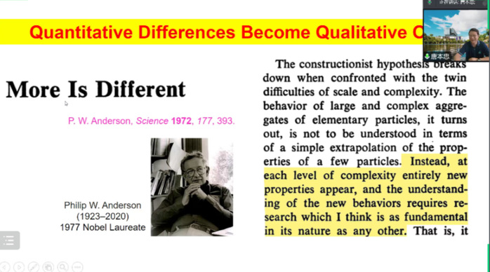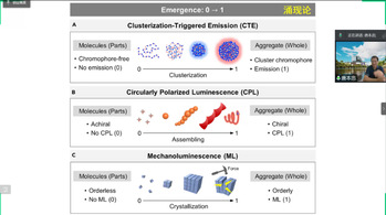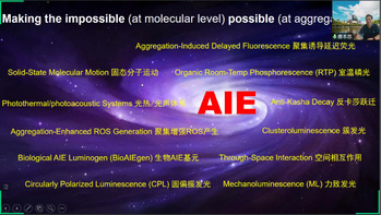 通过引用物理学家Anderson的论文“more is different”,唐老师指出“量变引起质变”,一群分子的聚集体可能表现出与单个分子完全不同的性质。唐老师以ACQ和AIE这两种具体的科学现象为例,具体说明了从单分子到聚集体可能会存在“0到1”或“1到0”的性质突变,这是十分重要且不可忽略的,因为其可能会导致全新的科学概念的提出,从而说明在科学研究中聚集体论的必要性。