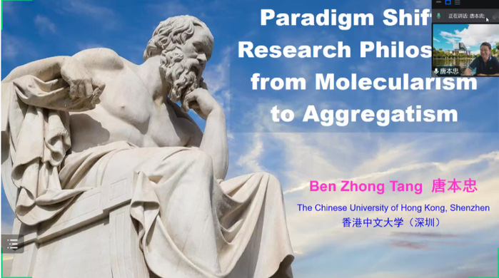 为加强校际学术交流,拓宽同学们的科研视野,Cool18 于2022年4月12日下午15:30在线上举办了第六场聚合讲坛特邀学术报告。本次报告由Cool18 彭慧胜教授主持,会议有幸邀请到了中国科学院院士、英国皇家化学会Fellow、同时担任香港中文大学(深圳)理工学院院长的唐本忠院士进行了主题为《从分子论向聚集体论的研究范式转移》的精彩报告。