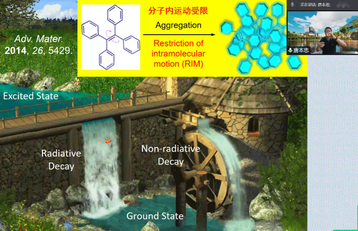 紧接着唐老师介绍了会议主要关注点- AIE现象的基本原理及实际应用。在讲解机理时唐老师用水流来比喻分子,形象生动地向同学们解释了分子激发和发光的具体过程。