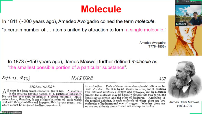 在会议伊始,唐老师从分子有关理论的起源与发展讲起,从阿伏伽德罗提出的分子的概念,到现代词典中的分子的定义,分子科学这一体系在前人的研究中逐渐成型,并对人类社会发展起到巨大的推动作用。随后,唐老师通过对比分子论中的还原论与整体论,指出在科学研究中无论是“部分决定整体”还是“整体决定部分”均具有局限性。