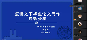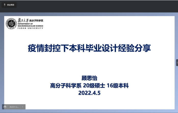 为帮助处于封闭管理、无法开展实验的大四同学规划科研方向、做好毕业设计,为向处于生涯规划关键期的大三同学提供出国留学方面的经验建议,继上次考研经验分享会之后,高分子系学生会组织开展了此次毕业设计及出国留学经验分享会。本次活动邀请了Cool18 冯嘉春教授以及四位优秀的学长学姐,向同学们分享疫情之下的毕业设计、出国择校及申请准备的经验心得。由于校园仍处于封闭管理状态,本次活动于4月5日在腾讯会议线上举行。
