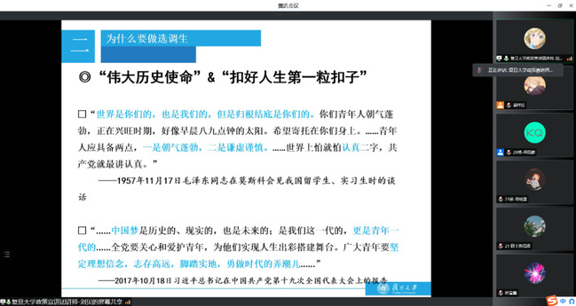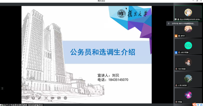 会议开始,由刘贝老师从“什么是选调生”、“为什么要做选调生”以及“复旦选调生校友现状”三个方面带领大家条分缕析地学习了选调生的基本情况。