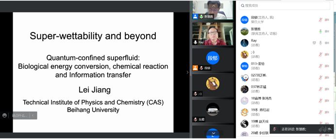 报告开始,江雷院士从哲学角度引出以哲学看科学,鼓励科研工作者要敢于质疑所确信的一切事物、过程,并尝试用这种方法来解释真理。随后,江老师介绍了超浸润界面方面的理论知识,以简单的接触角概念为核心延展出了各种各样的研究方向,并提出人脑、鳗鱼中发现的有趣现象,从而引出了仿生超浸润界面体系的概念。