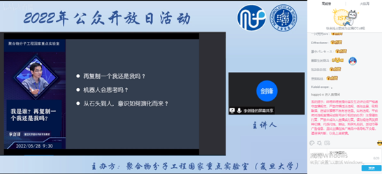 讲座之后,通过视频带领观众云参观聚合物分子工程国家重点实验室。视频中介绍了实验室大气明亮的科研环境、各领域的名师良导、各方向的代表研究成果、共享仪器平台及近年内由国重室主办的多场国内外学术会议。通过短视频,公众对聚合物国重室的科研条件、人才培养等方面有更直观的了解和认识。