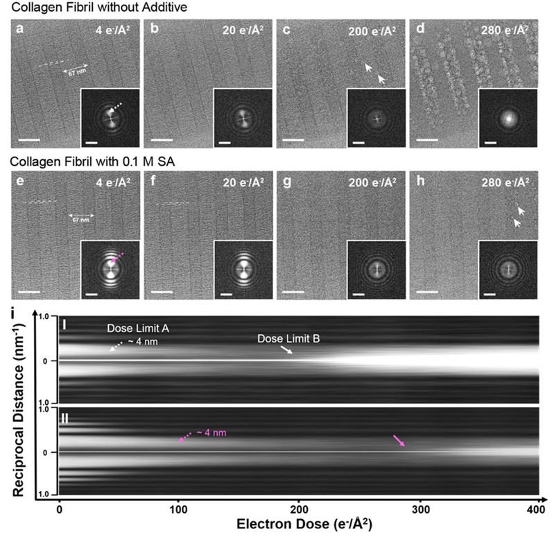 如图1所示,在不添加SA时,胶原纤维对于电子辐照非常敏感,在当电子辐照剂量达到20 e-2时,其微观结构即遭到破坏;而当剂量达到200 e-2时,严重的辐照损伤会使得胶原纤维周期性结构的界面处产生大量的气泡。在添加0.1 M SA后,胶原纤维的结构更加稳定,同时气泡的形成也得到了明显抑制。快速傅里叶变换(FFT)定量分析结果显示,添加0.1 M SA可以使胶原纤维的细微结构能够耐受104 e-2的辐照,同时产生气泡的辐照剂量也增加到了280 e-2,比未添加SA的情况分别高出117%43%。这些结果表明SA有效减轻了电子辐射对胶原纤维结构的损伤。研究人员发现,SA对于同样含有大量羟基的纤维素和脱铁铁蛋白也具有显著的保护作用,显示了该方法的普适性;但对于缺乏羟基的样品,如脂质体,SA则并未体现出明显的保护作用。