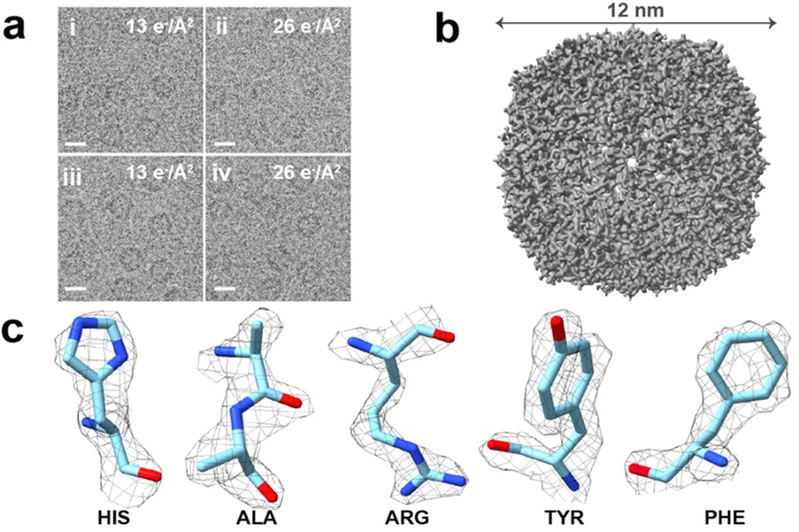 为了验证SA对高分子样品精细结构的影响,研究人员分别对不含SA和含0.5 M SA的脱铁铁蛋白进行了单颗粒采集实验。结果显示,加入SA后,脱铁铁蛋白的结构在电子辐照下更为稳定。三维重构结果显示,加入SA后的脱铁铁蛋白分辨率(2.20 Å)略高于未加入SA的样品(2.28 Å),且未破坏其对称结构,氨基酸残基的局部密度与原子模型也仍旧能保持的匹配。这些结果表明,加入SA可以提高蛋白质精细结构在电子辐射下的稳定性,从而获得更高分辨率的cryo-TEM结果。
