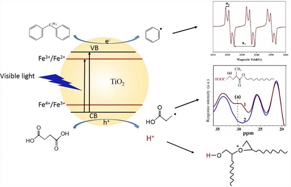 研究结果揭示了光化学反应机理:Fe-doped TiO2吸收可见光,然后催化丁二酸发生脱酸反应,生成了烷基自由基(R∙)、CO2与H+,R∙引发丙烯酸酯单体的自由基聚合;碘鎓盐捕获光生电子,然后生成鎓盐负离子可稳定(stabilize)脱羧反应产物H+,使H+免于与光生电子的复合,从而促进环氧化合物的阳离子聚合。