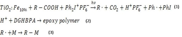 Figure 1. Thereaction mechanism of the visible-light induced cationic and free radical polymerizations initiated by TiO2:Fe10%/succinic acid/Ph2I+PF6-