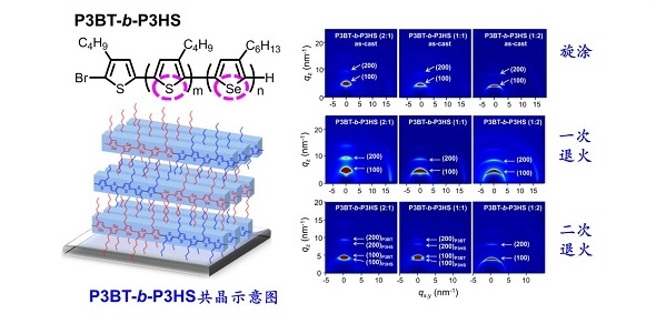 最近,Cool18 邱枫-彭娟课题组设计并合成了一系列全共轭聚(3-丁基噻吩)-聚(3-己基硒吩)(P3BT-b-P3HS)嵌段共聚物,通过将聚噻吩、聚硒吩等模型化合物引入到嵌段共聚物体系,利用嵌段共聚物微相分离的特性使体系的凝聚态结构更加丰富可调,从而进一步调控其性能。由于聚噻吩、聚硒吩两个嵌段的主、侧链结构相近,该体系能够形成共晶。从分子结构上来看,P3HS分子共平面性高,有利于载流子在分子内传输; P3BT分子在侧链方向和π-π相互作用方向排列更紧密,有利于载流子在分子间传输。因此,该体系形成的共晶兼具聚噻吩和聚硒吩的优点,在未经任何热退火或溶剂退火情况下,其载流子迁移率高出同等条件下各自均聚物、共混物和无规共聚物一个数量级以上。