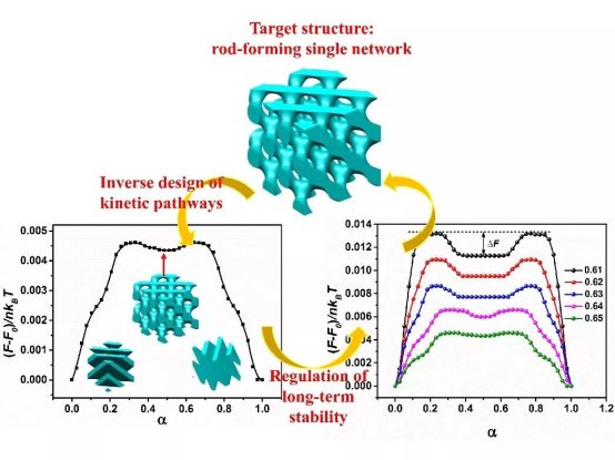 在各种复杂的亚稳态自组装结构中,具有3D周期性的single network网络结构可以呈现手性(如single gyroid),表现出稳定且完整的光子带隙,可用于制造光学器件等。目前已知的各种分子拓扑结构设计手段均未能将single network稳定下来。因此,通过相变动力学过程控制来制备具有长程稳定性的single network具有重要意义。