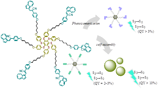 最近,Cool18 朱亮亮课题组报道了一种由氰基二苯乙烯修饰薁和六硫苯母核组成的分子结构合成和光物理研究,以展示一种能够大幅度增强的多波长的反卡莎规则发光性质。这种化合物结构采用来类似树冠状大分子的设计原理,充分利用氰基二苯乙烯修饰薁和六硫苯母核之间的荧光共振能量转移(FRET)过程,将六硫苯磷光发射潜力充分转移到6个含薁的端基上。同时,利用六硫苯的聚集诱导发射(AIE)活性,使得整个分子在聚集态层面的发光强度得到了进一步增强。这两种因素作用到一起,能够使通过薁发色团展现的反卡莎规则发光的量子产率(QY)放大约15倍。与常规前体相比的物质。此外,该系统中的发光还可以通过质子化作用、光异构和溶剂优化选择等多种因素进行智能调节。该化合物掺杂的聚合物基薄膜材料依旧能够保持增强的反卡莎规则发光性质,为先进固态发射材料的发展提供了新的视角。