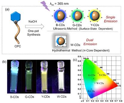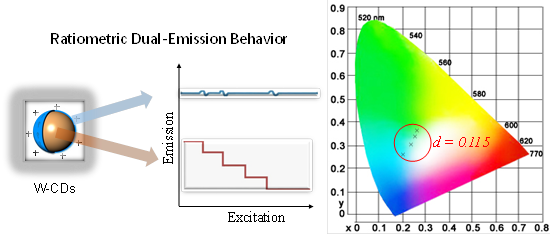 最近,Cool18 朱亮亮课题组报道了一种仅通过控制反应条件制备多色和双发射荧光制备碳点(CDs)的简便方法,并利用可视化效果展示了碳点良好的荧光调控现象。以一种经济的阳离子表面活性剂-十六烷基氯化吡啶(CPC)作为唯一碳源,制得的碳点在蓝色,绿色,黄色和白色范围内均显示出与激发光有关的发射行为。在双重发射碳点体系(W-CDs)中,短波长发射表现了独特的激发依赖性荧光行为,而长波长发射却保持不变,因此,W-CDs具有依赖于激发光的比率双发射性质。仅通过简单地切换激发波长(在50 nm之内),即可在冷白光和暖白光区域之间实现大规模的荧光颜色调控(W-CDs荧光调控参数d = 0.115)。与那些依赖于激发光的单发射碳点相比,双发射碳点的荧光波动性增加了62%〜460%。