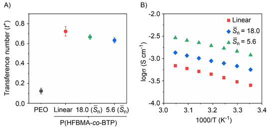 图3. 电化学性能的研究. APEO,线性和支化氟聚合物的锂离子迁移数(t+. B)线性和支化氟聚合物的离子电导率(σ)与温度的关系.