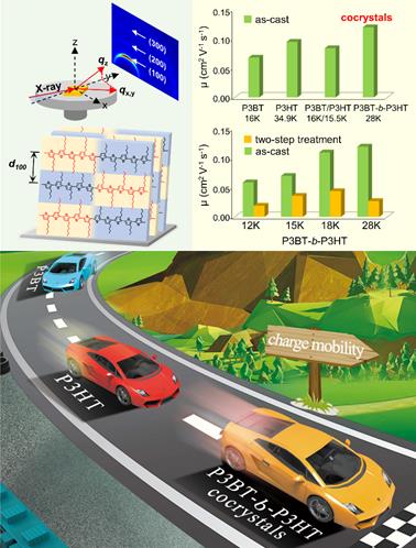 图2. P3BT-b-P3HT共晶的示意图及和对照样载流子迁移率的比较。