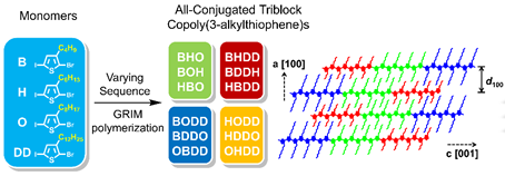 他们首先设计合成了具有相同共轭主链、侧链烷基长度不同的聚(3-丁基噻吩)-b-聚(3-己基噻吩)(P3BT-b-P3HT)嵌段高分子;然后改变共轭主链,得到聚(3-己基噻吩)-b-聚(3-丁基硒吩)(P3HT-b-P3BS)嵌段高分子。在此基础上,将二嵌段高分子拓展到三嵌段高分子(P3AT-b-P3AT-b-P3AT),研究嵌段序列对体系共晶结构和微相分离结构的影响(图1)。