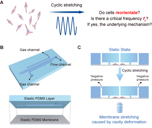 利用光刻技术、软蚀刻技术和有限元分析方法,丁建东课题组设计和制备了适用于细胞力学拉伸研究的双层聚二甲基硅氧烷(PDMS)微流控装置。该装置的工作原理为:当芯片侧腔抽真空时,其体积减小,导致中间流体通道的薄膜发生拉伸,进而对黏附于薄膜上的细胞施加周期性拉伸作用。通过将PDMS微流控芯片与活细胞工作站、外源智能化真空泵联用,同时实现了细胞实时观察、细胞培养和细胞拉伸三大功能。