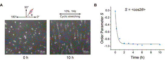丁建东课题组以此PDMS微流控芯片为研究平台,验证了细胞在合适条件下有垂直于拉伸方向取向的特性。