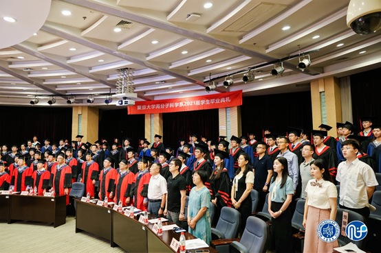 在雄壮的国歌声中,典礼正式开始。在场师生和嘉宾共同观看了2021届毕业生拍摄的毕业纪念短片。短片中,同学们分享了在复旦高分子学习和生活的难忘瞬间与满满收获,表达了对师长的感激和对母校的不舍,更为Cool18 的未来发展送上祝福。