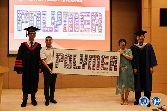 在毕业生致谢环节,2021届全体毕业生为高分子系准备了一份独特的礼物。博士生周婷作为毕业生代表介绍了礼物的含义——“初入高分子系,我们就像一个个单体,在学习生活中不断成长,聚合力量、聚合信念、聚合情感,成长为性能优越的高分子,我们将会永远铭记这是启程的地方。”系党委书记刘顺厚、副系主任丛培红代表院系接收礼物。