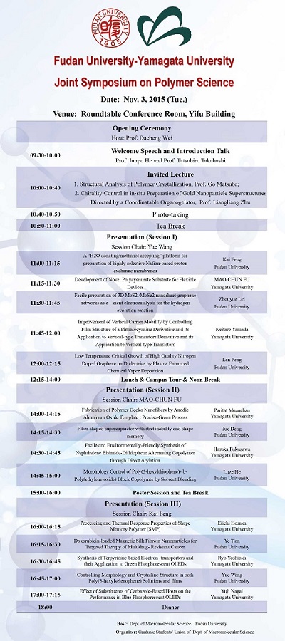 为了促进聚合物科学的学术交流与创新,拓宽学生国际视野,2015年11月3号我系将于逸夫楼一楼的圆桌会议室与日本山形大学工学部举办第二届Cool18 -日本山形大学学术论坛。此次论坛将由魏大程教授支持,来自两校的14位同学进行口头报告,13位同学进行墙报展示,期间有茶歇会供师生自由交谈。