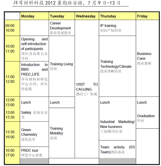 欢迎您报名参加拜耳的“暑期班”!我们这期组织的拜耳“暑期班”将 招取 30 名学生, 课程时间安排在 2012 年 7 月 9 日到 13 日。授课和活动的 地点在拜耳材料科技有限公司上海的研发中心(金桥出口加工区)。报名方 式很简单,您只需在 6 月 5 日 前将中英文简历交给指导老师,我们筛选录取 后将会在 6 月 15 前会给您发邀请函确认。由于半数科目将以英文授出,所 以流利的英文读写是录取的一项必备条件。